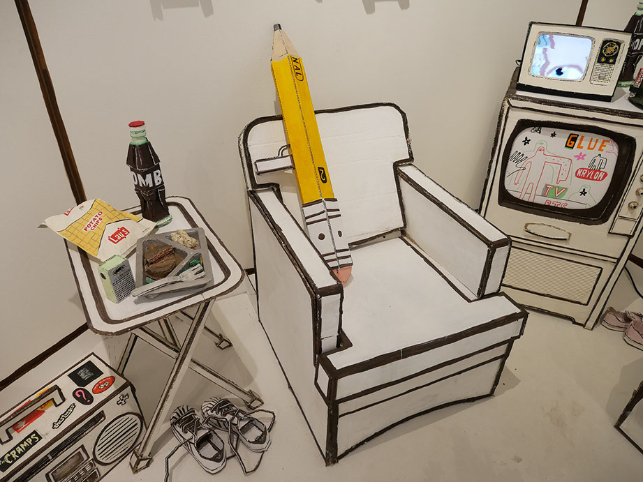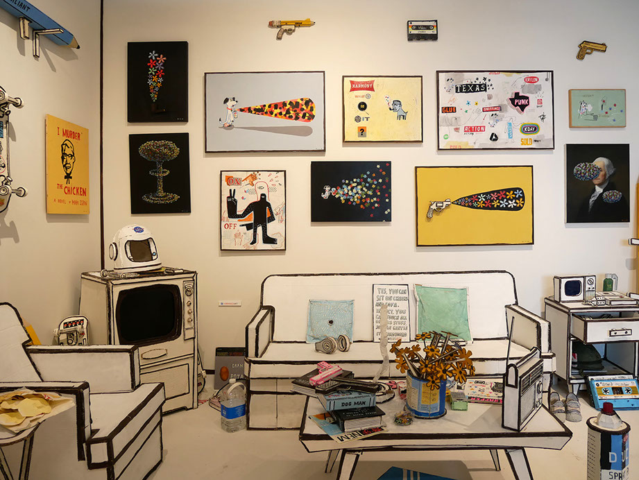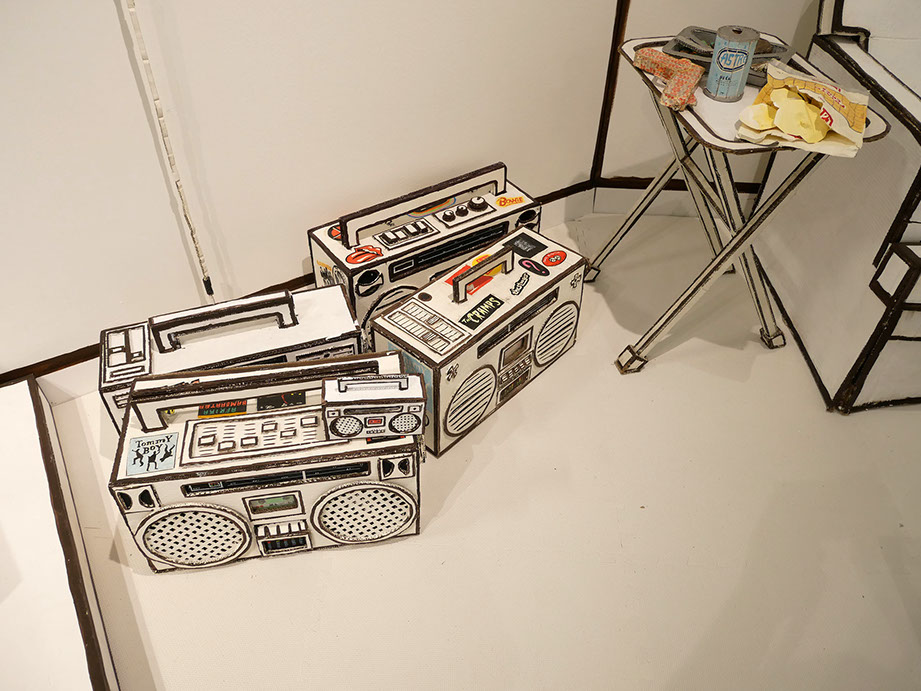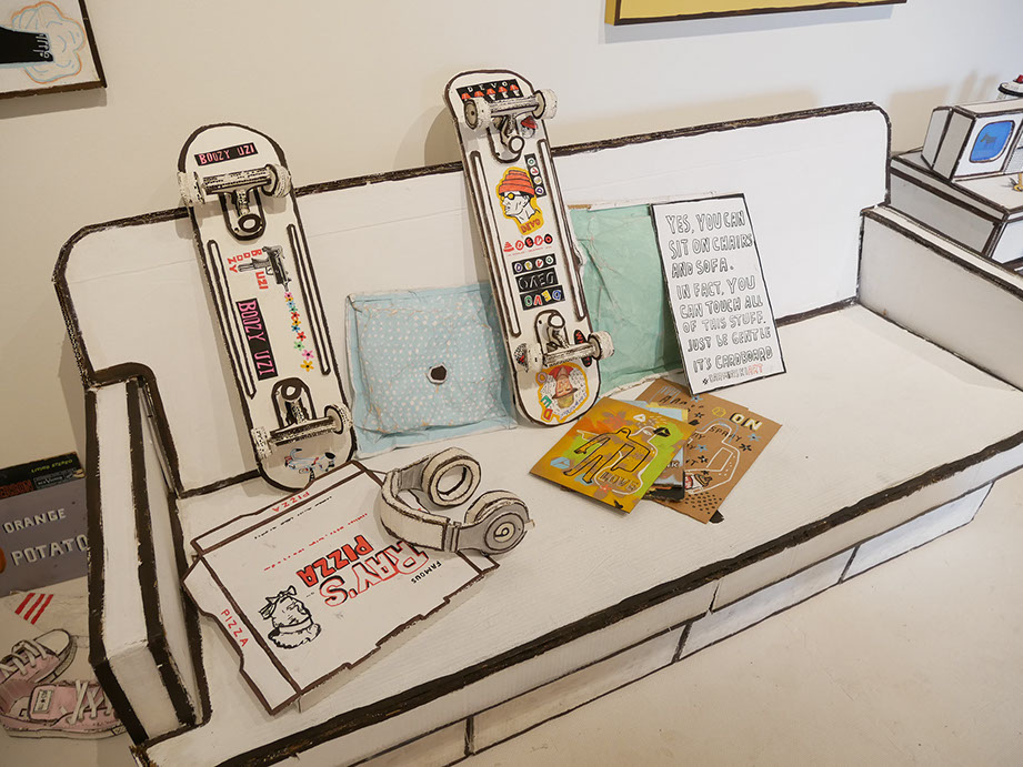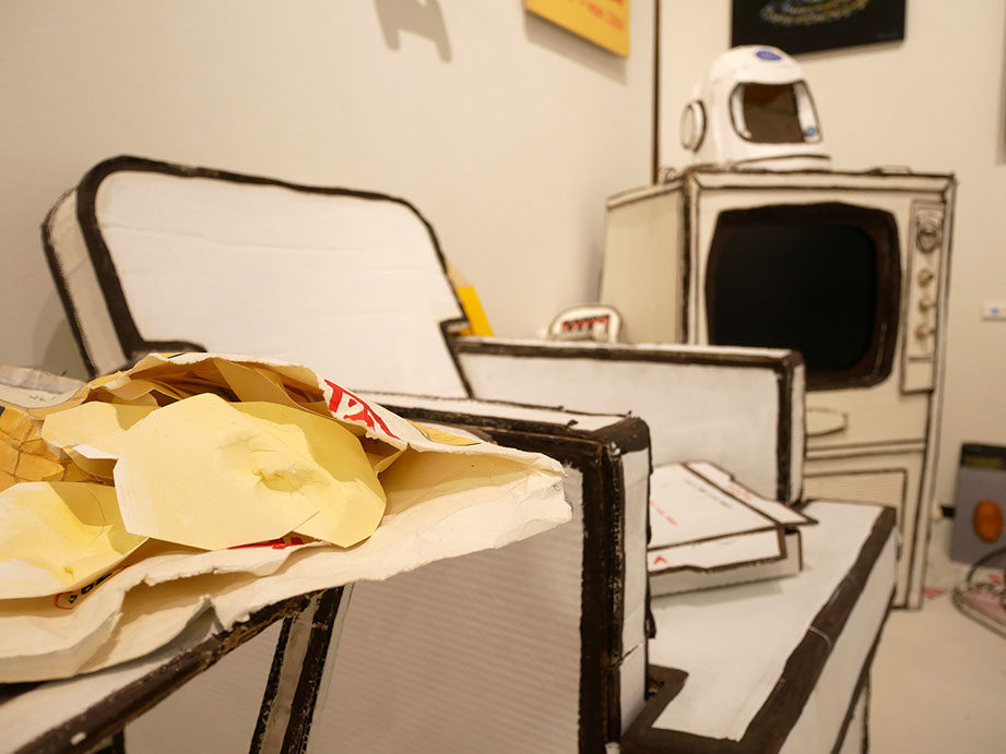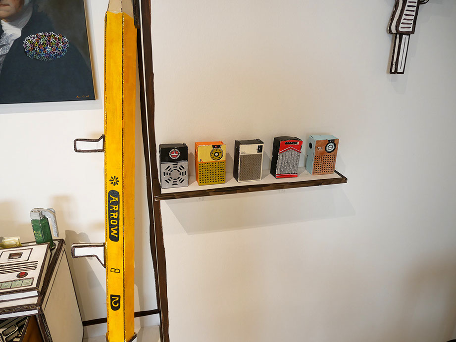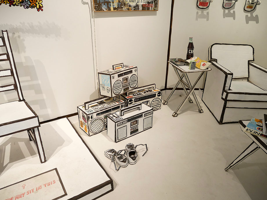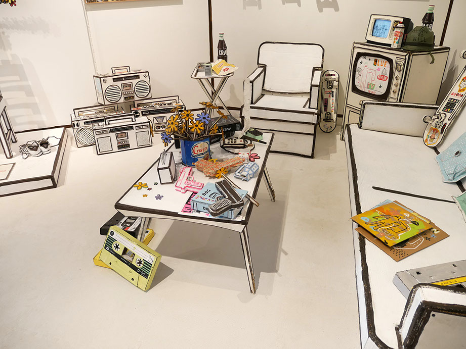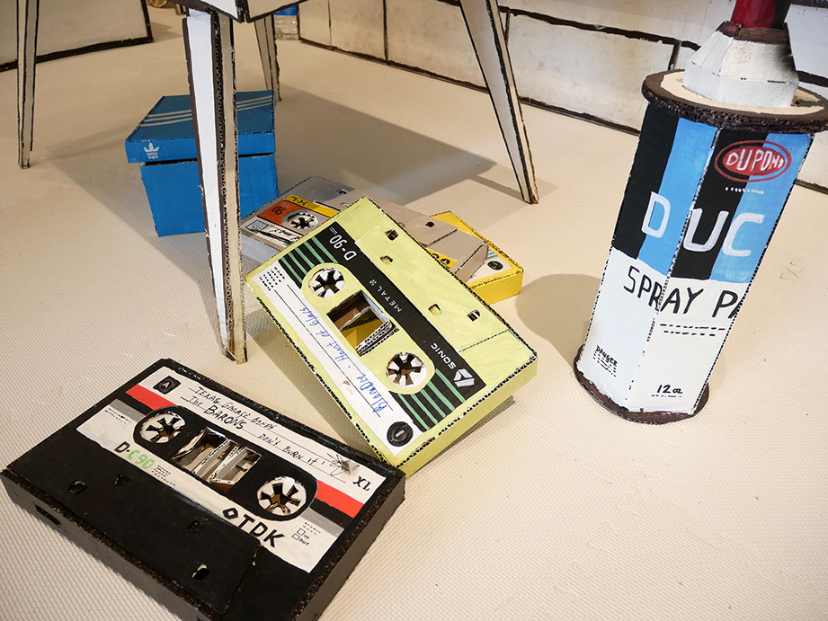 Breaking the traditional relationship between artist and audience, Mark Isbins' Living Room introduces an unexpected element of playfulness and fun to the art space. Yes, you are allowed to touch everything in the room. You can sit on all the furniture. You pick up anything and play with it and often find a surprise audio element. The cardboard radios play actual songs. The space helmet plays a clip from the Apollo 11 moon landing. The talking GI-Joe's talk. Many of the XL cassettes play music. Each one of of these cardboard sculptures require audience participation in order for the sculpture to be complete. The spray cans for instance are not finished until someone picks them up and shakes them and hears that familiar rattling sound.