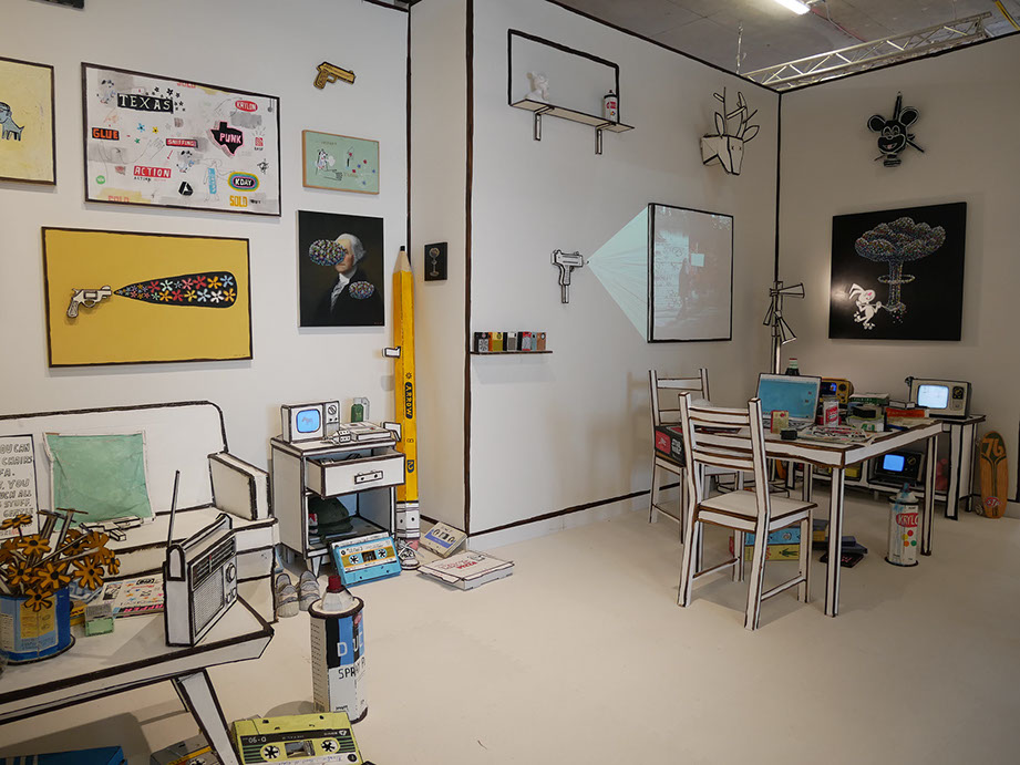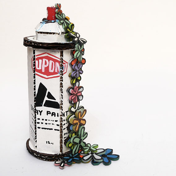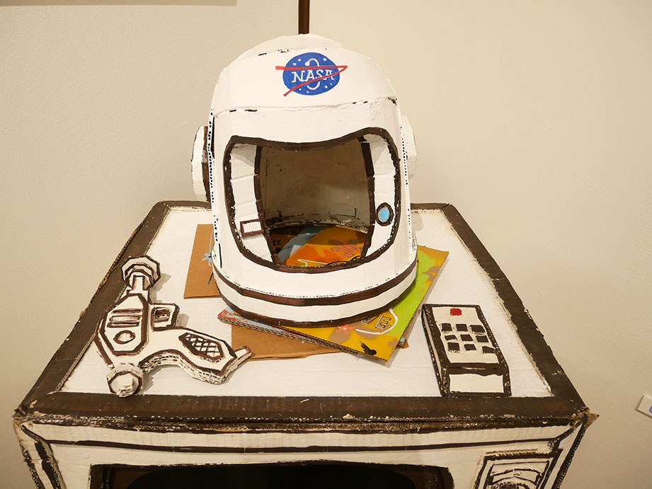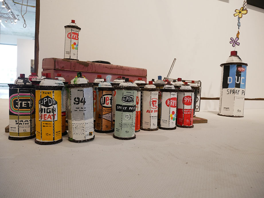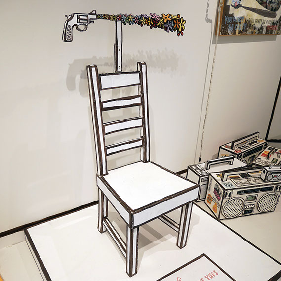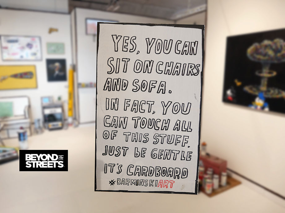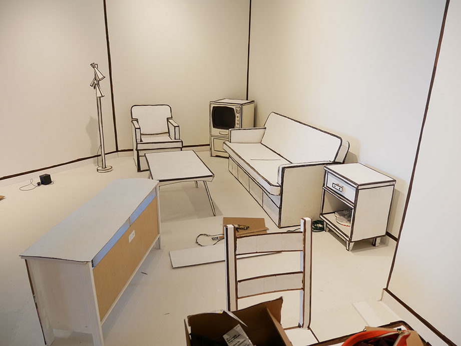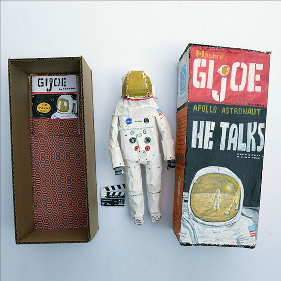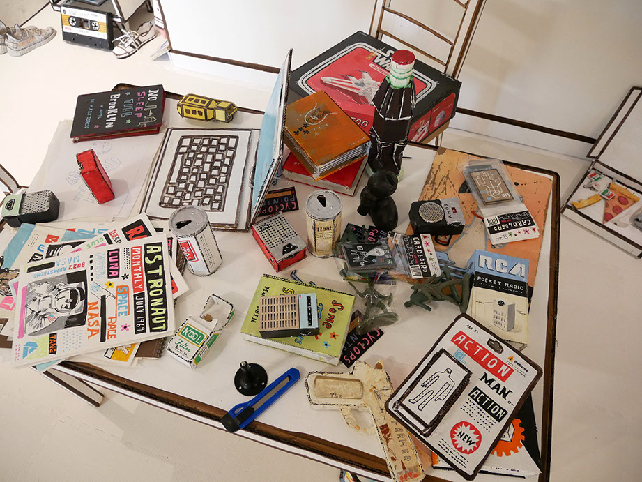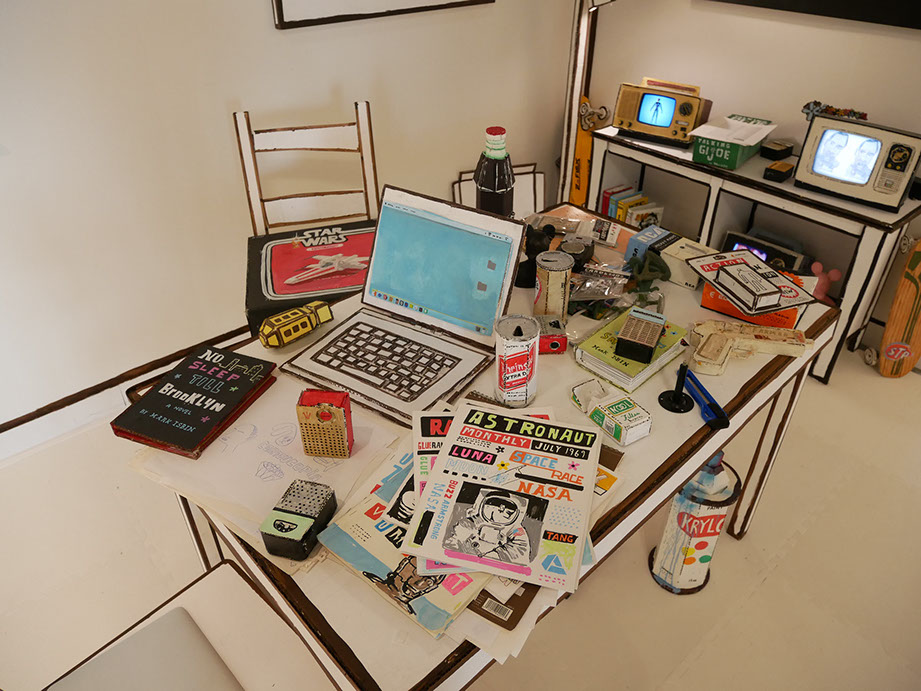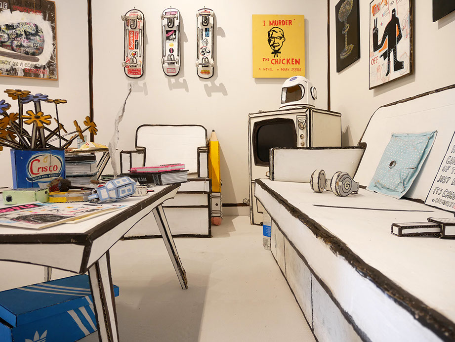 Breaking the traditional relationship between artist and audience, Mark Isbins' Living Room introduces an unexpected element of playfulness and fun to the art space. Yes, you are allowed to touch everything in the room. You can sit on all the furniture. You pick up anything and play with it and often find a surprise audio element. The cardboard radios play actual songs. The space helmet plays a clip from the Apollo 11 moon landing. The talking GI-Joe's talk. Many of the XL cassettes play music. Each one of of these cardboard sculptures require audience participation in order for the sculpture to be complete. The spray cans for instance are not finished until someone picks them up and shakes them and hears that familiar rattling sound.