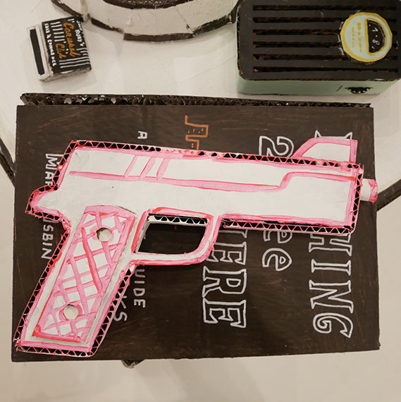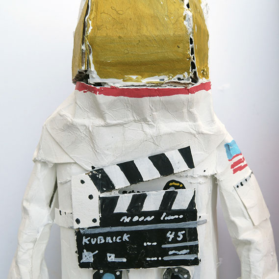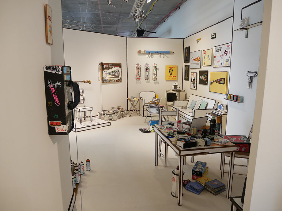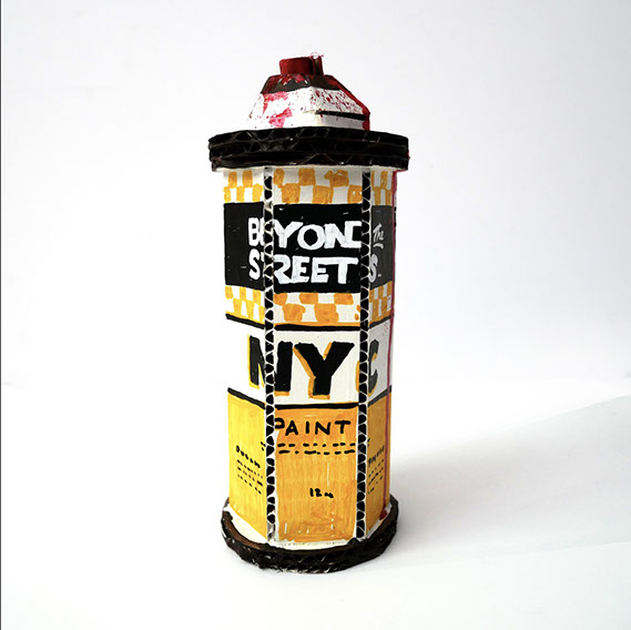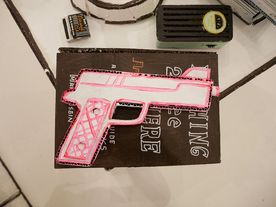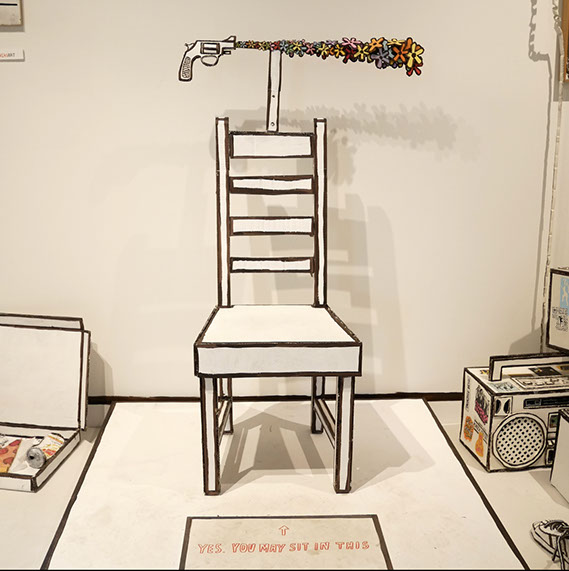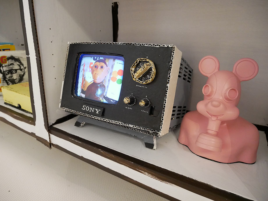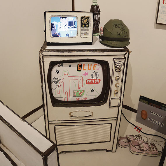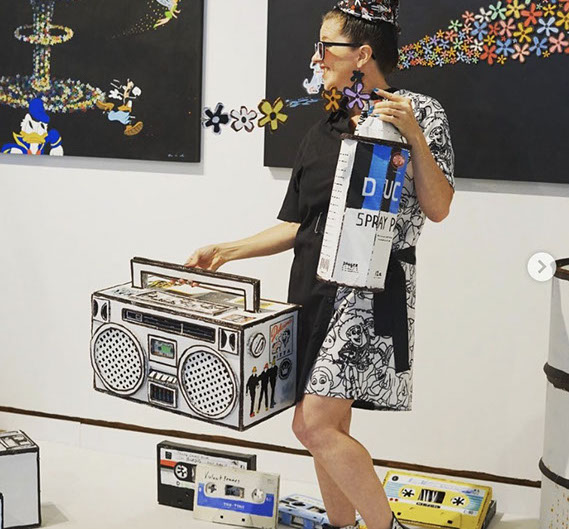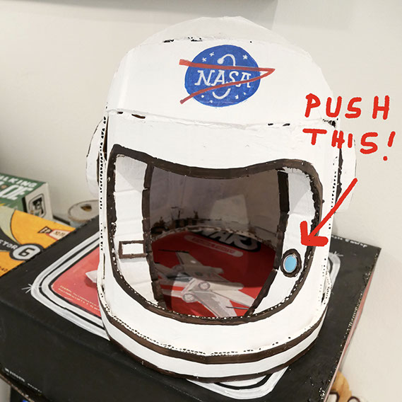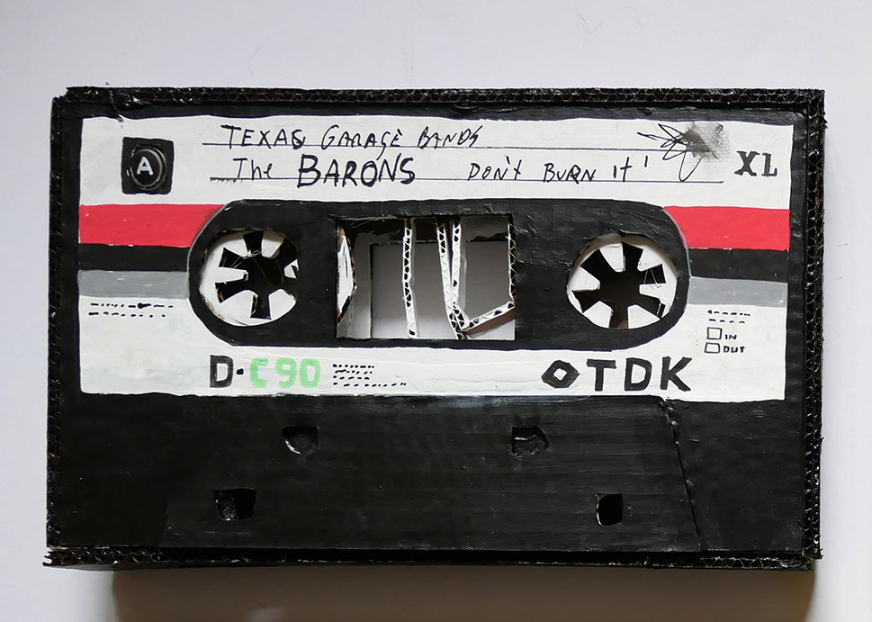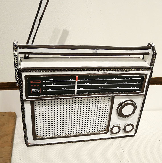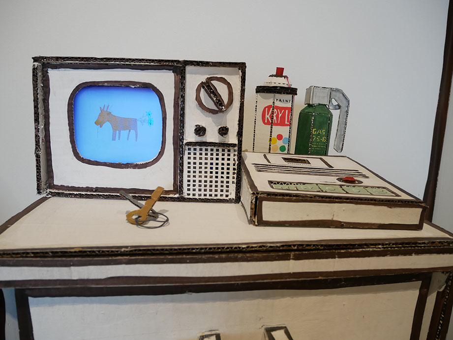 Breaking the traditional relationship between artist and audience, Mark Isbins' Living Room introduces an unexpected element of playfulness and fun to the art space. Yes, you are allowed to touch everything in the room. You can sit on all the furniture. You pick up anything and play with it and often find a surprise audio element. The cardboard radios play actual songs. The space helmet plays a clip from the Apollo 11 moon landing. The talking GI-Joe's talk. Many of the XL cassettes play music. Each one of of these cardboard sculptures require audience participation in order for the sculpture to be complete. The spray cans for instance are not finished until someone picks them up and shakes them and hears that familiar rattling sound.