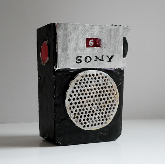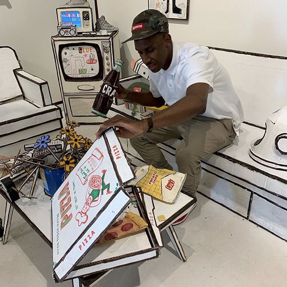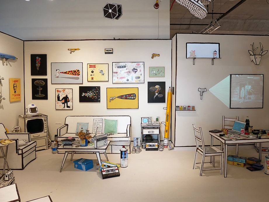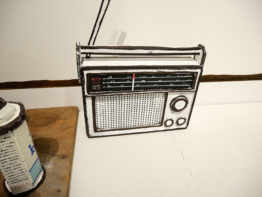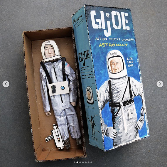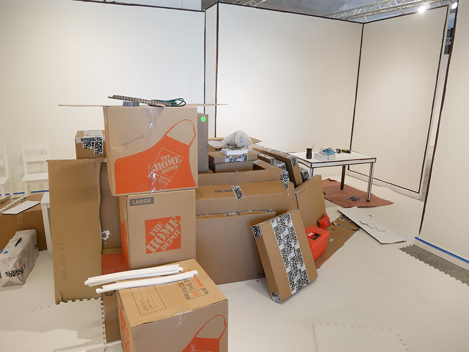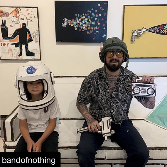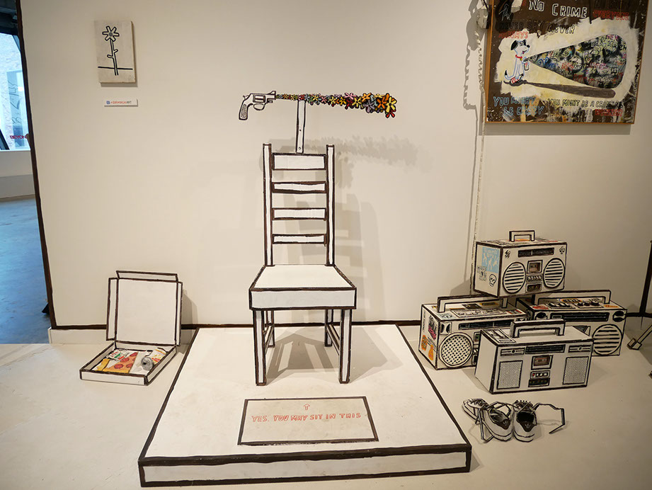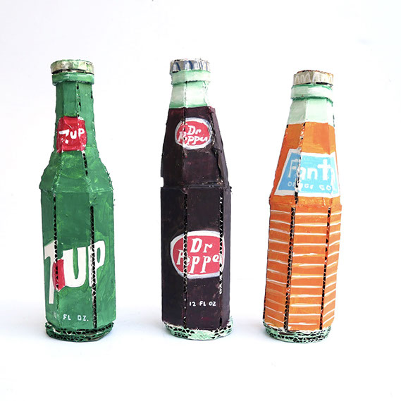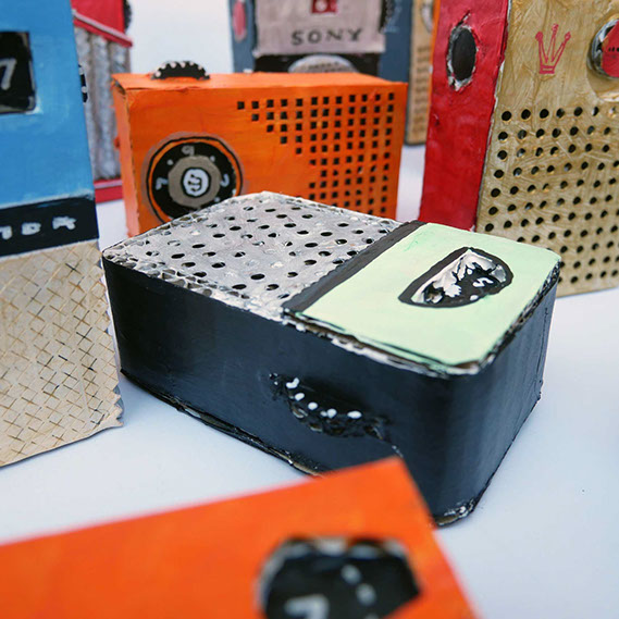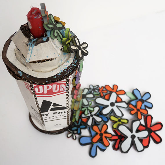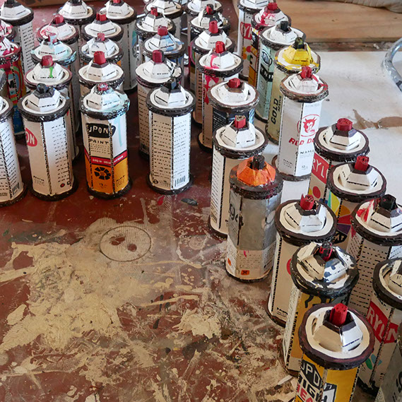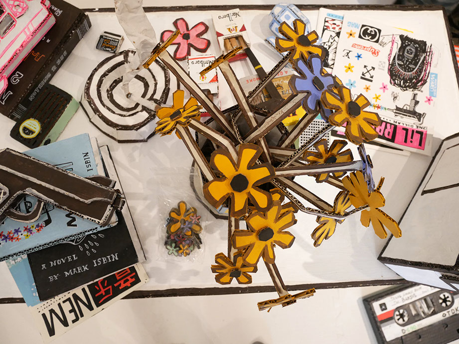 Breaking the traditional relationship between artist and audience, Mark Isbins' Living Room introduces an unexpected element of playfulness and fun to the art space. Yes, you are allowed to touch everything in the room. You can sit on all the furniture. You pick up anything and play with it and often find a surprise audio element. The cardboard radios play actual songs. The space helmet plays a clip from the Apollo 11 moon landing. The talking GI-Joe's talk. Many of the XL cassettes play music. Each one of of these cardboard sculptures require audience participation in order for the sculpture to be complete. The spray cans for instance are not finished until someone picks them up and shakes them and hears that familiar rattling sound.