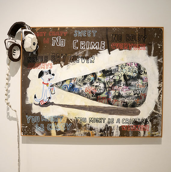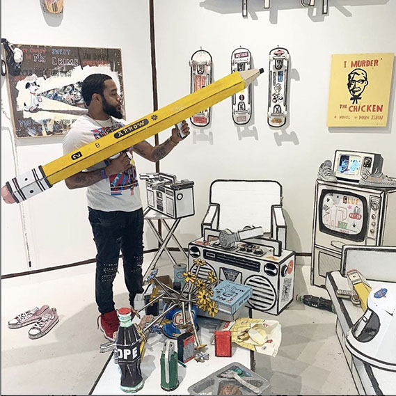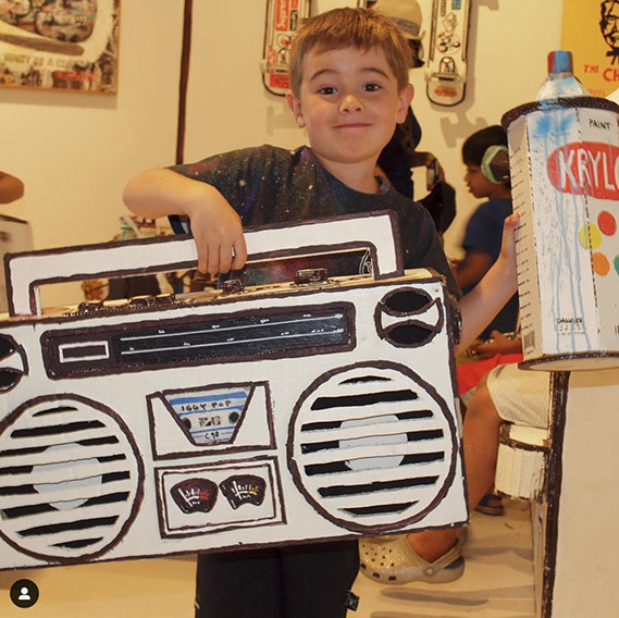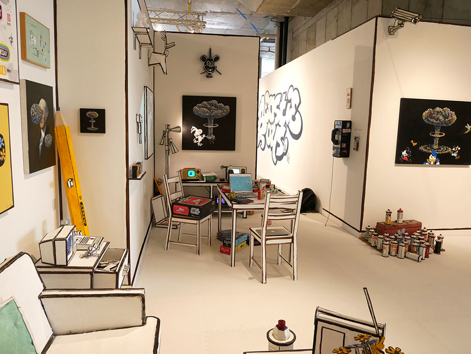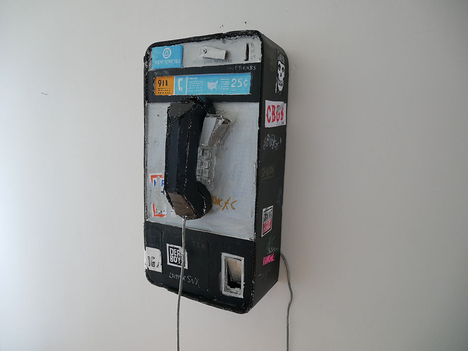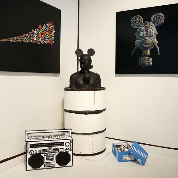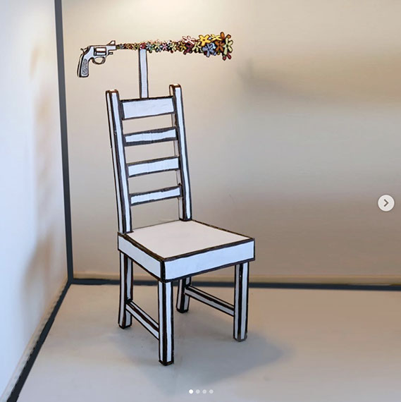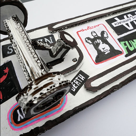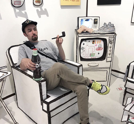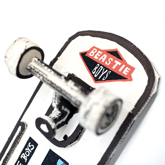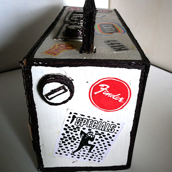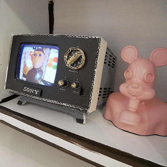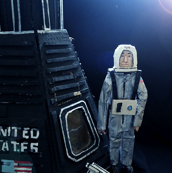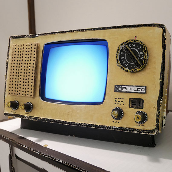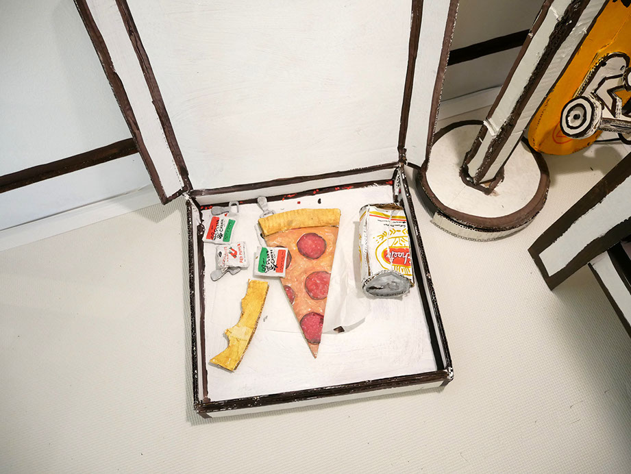 Breaking the traditional relationship between artist and audience, Mark Isbins' Living Room introduces an unexpected element of playfulness and fun to the art space. Yes, you are allowed to touch everything in the room. You can sit on all the furniture. You pick up anything and play with it and often find a surprise audio element. The cardboard radios play actual songs. The space helmet plays a clip from the Apollo 11 moon landing. The talking GI-Joe's talk. Many of the XL cassettes play music. Each one of of these cardboard sculptures require audience participation in order for the sculpture to be complete. The spray cans for instance are not finished until someone picks them up and shakes them and hears that familiar rattling sound.