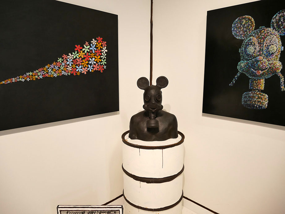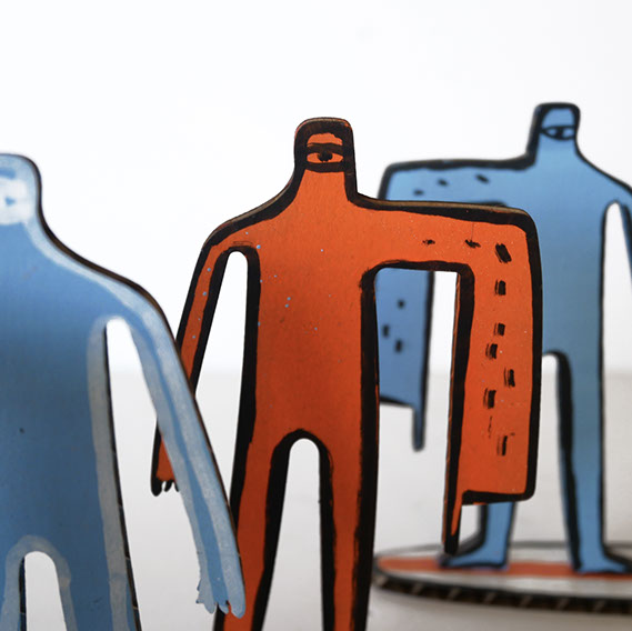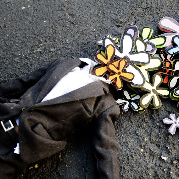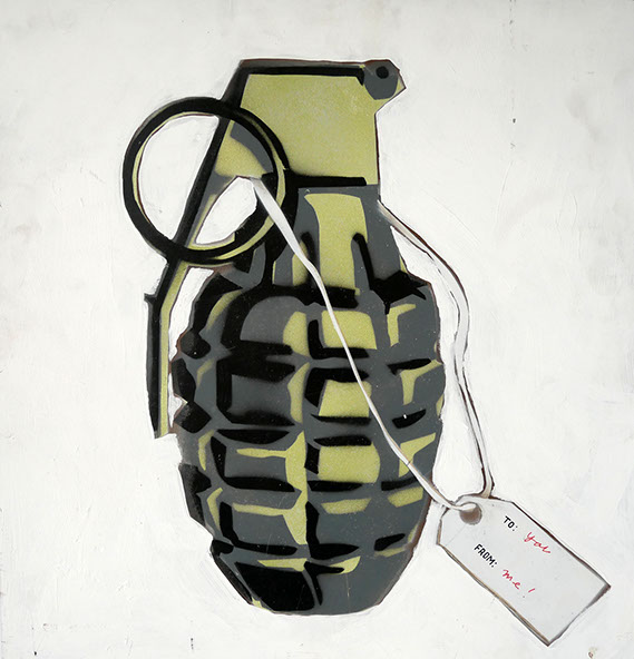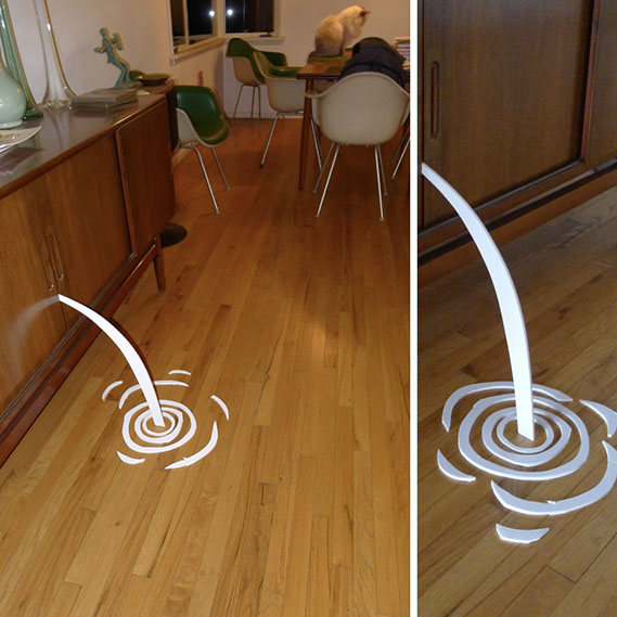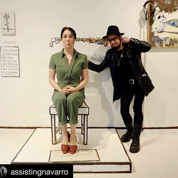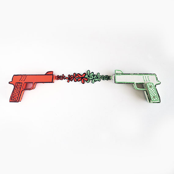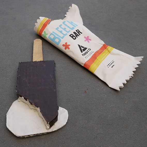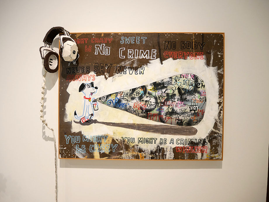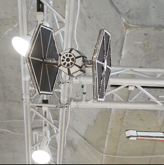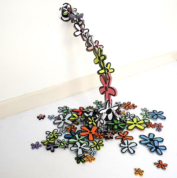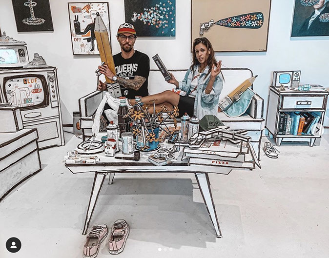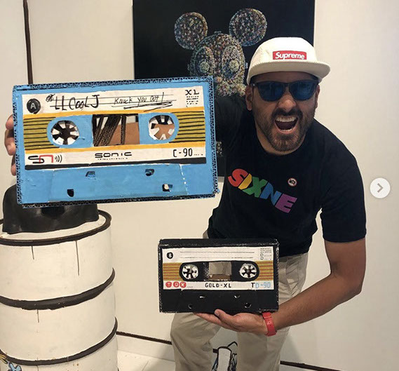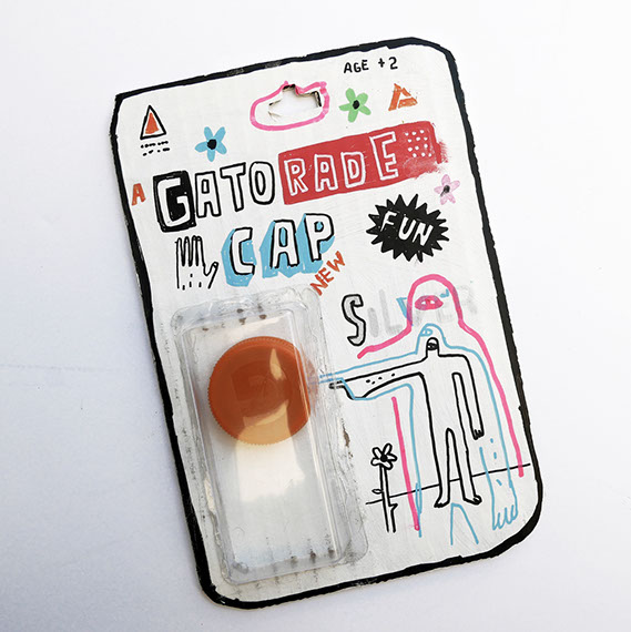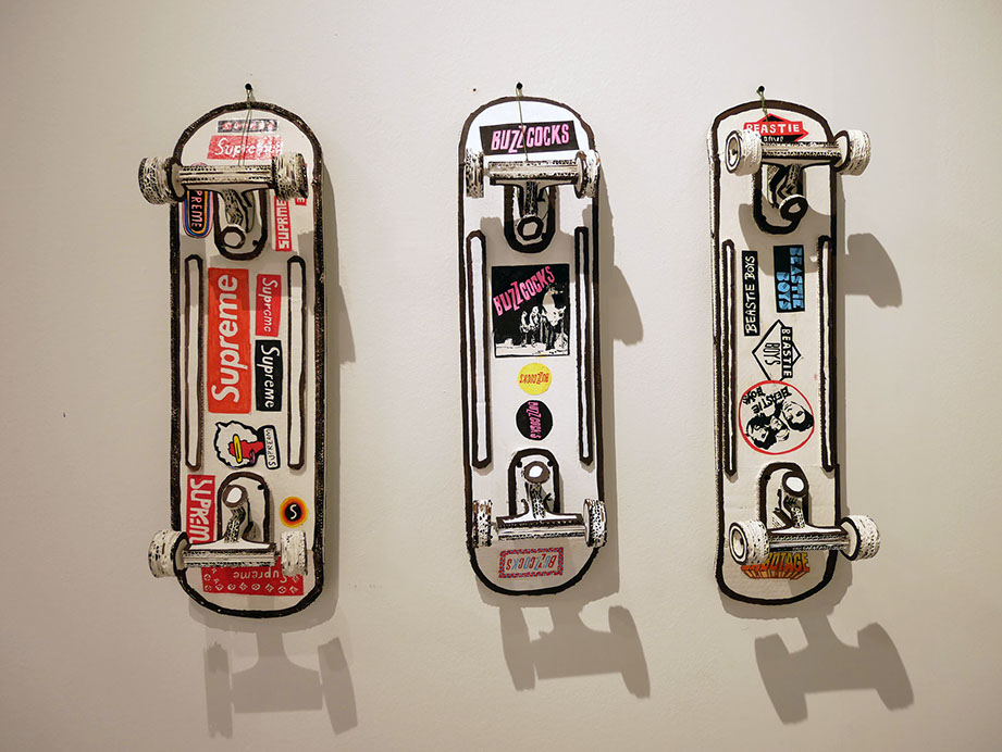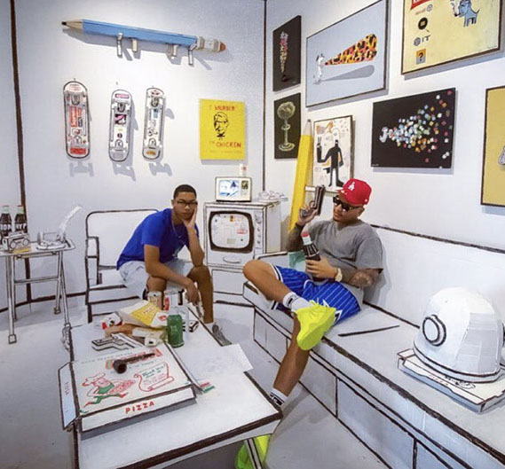 Breaking the traditional relationship between artist and audience, Mark Isbins' Living Room introduces an unexpected element of playfulness and fun to the art space. Yes, you are allowed to touch everything in the room. You can sit on all the furniture. You pick up anything and play with it and often find a surprise audio element. The cardboard radios play actual songs. The space helmet plays a clip from the Apollo 11 moon landing. The talking GI-Joe's talk. Many of the XL cassettes play music. Each one of of these cardboard sculptures require audience participation in order for the sculpture to be complete. The spray cans for instance are not finished until someone picks them up and shakes them and hears that familiar rattling sound.