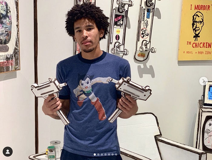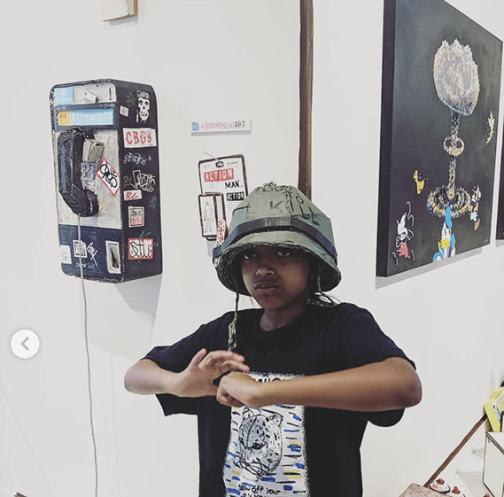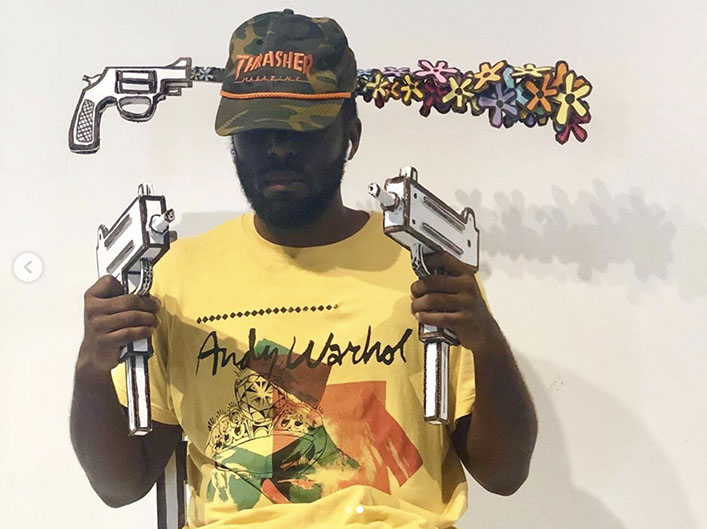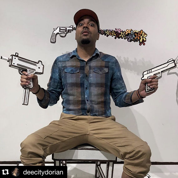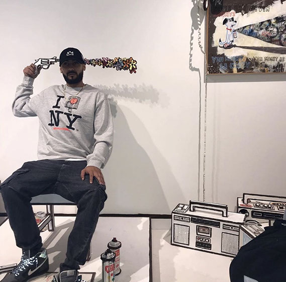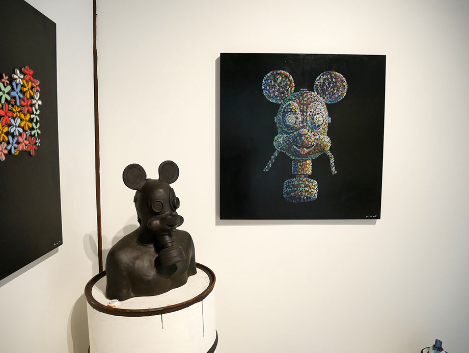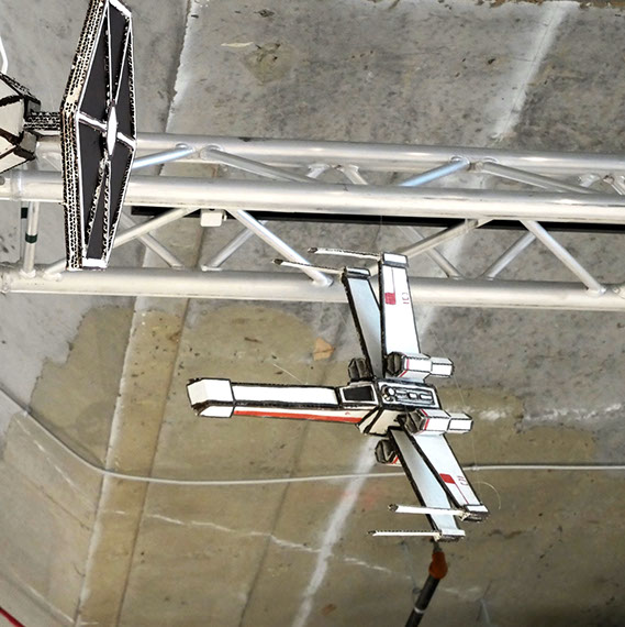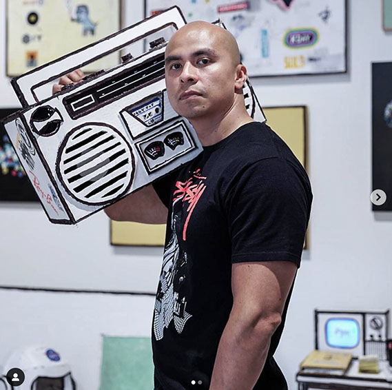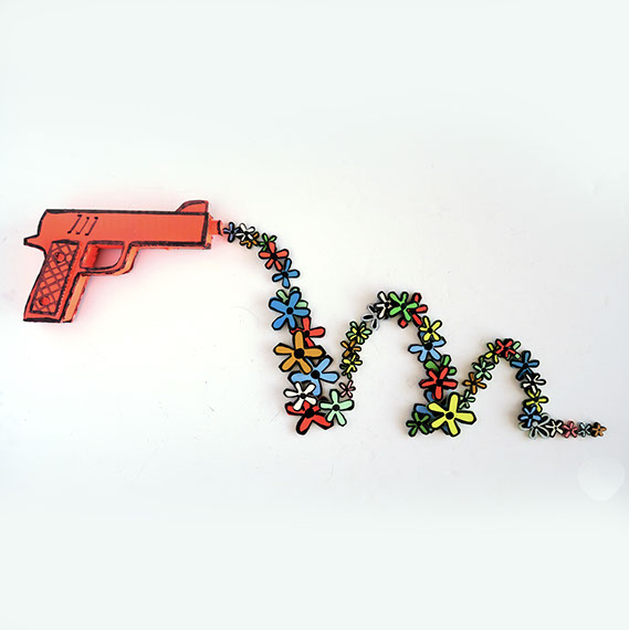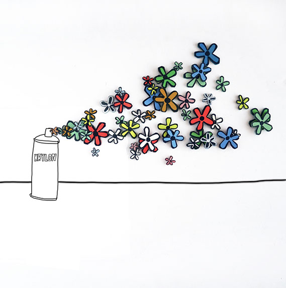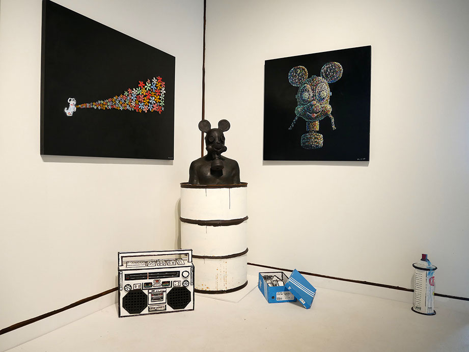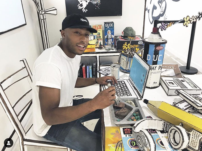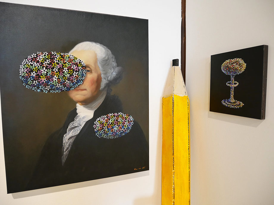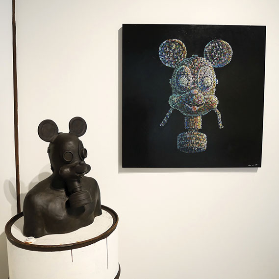 Breaking the traditional relationship between artist and audience, Mark Isbins' Living Room introduces an unexpected element of playfulness and fun to the art space. Yes, you are allowed to touch everything in the room. You can sit on all the furniture. You pick up anything and play with it and often find a surprise audio element. The cardboard radios play actual songs. The space helmet plays a clip from the Apollo 11 moon landing. The talking GI-Joe's talk. Many of the XL cassettes play music. Each one of of these cardboard sculptures require audience participation in order for the sculpture to be complete. The spray cans for instance are not finished until someone picks them up and shakes them and hears that familiar rattling sound.